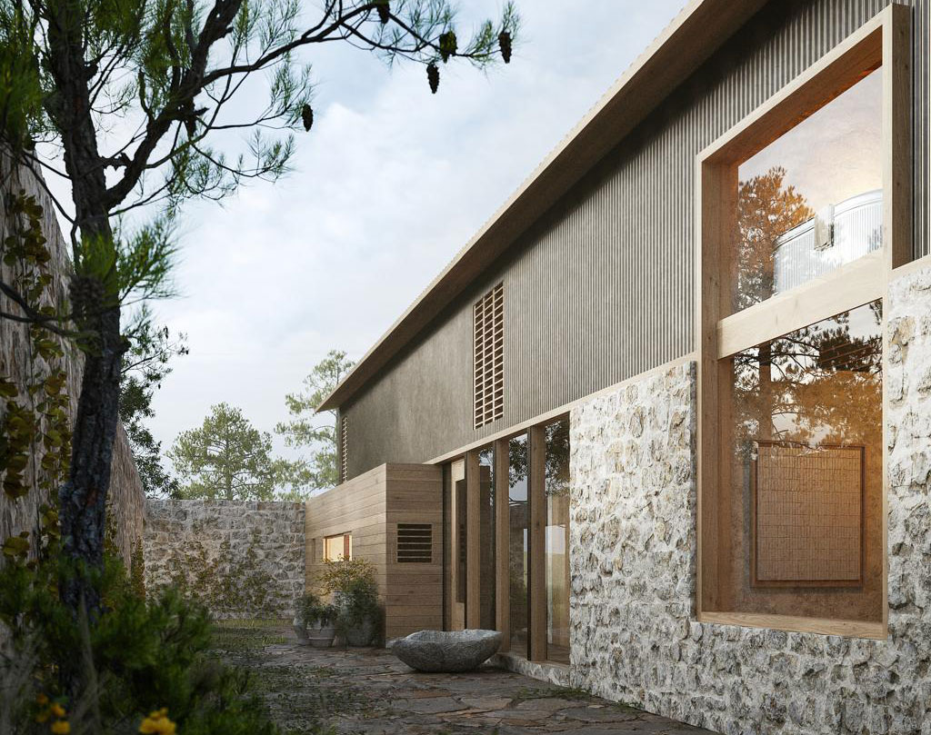 La arquitectura sigue un estilo contemporáneo con materiales naturales como piedra y madera, que se mezclan con el entorno.